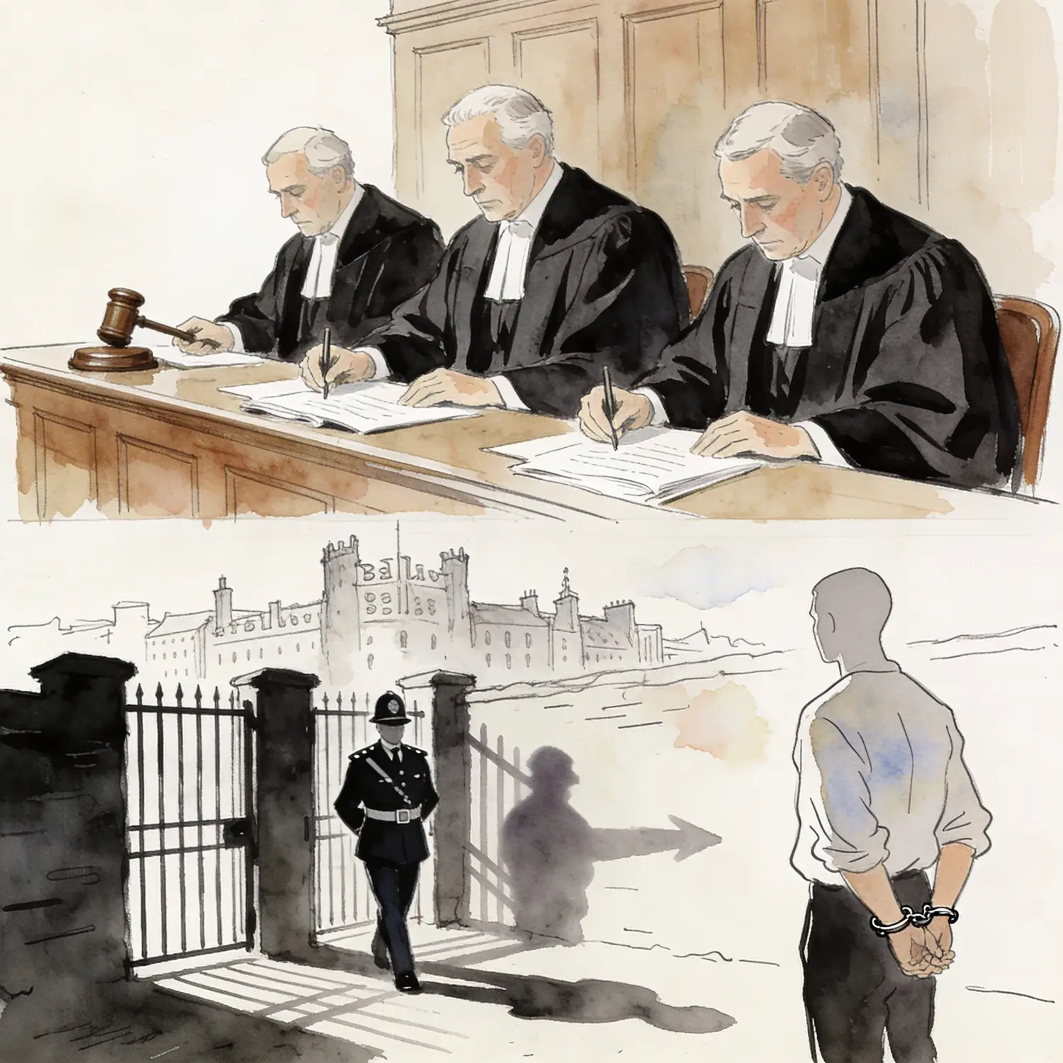 Jonathan Brown and Mark Sewell had pleaded guilty to the murder. Glenn Rainey, Walter Alan Ervine and Robert Spiers were convicted on 22 November 2024 following a trial before Mr Justice McFarland, sitting without a jury under the Justice and Security (Northern Ireland) Act 2007. All five were sentenced to life imprisonment. Rainey, Ervine and Spiers received minimum tariffs of 20 years before parole consideration. Brown and Sewell received tariffs of 17.5 years, reflecting a reduction for their guilty pleas.